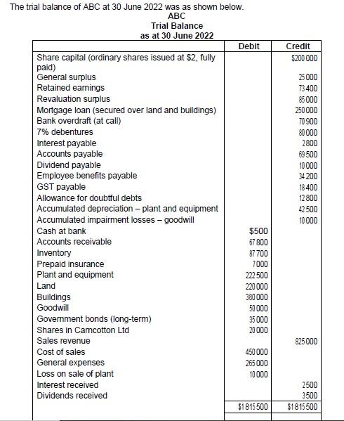 Solved Credit 200 000 The Trial Balance Of Abc At 30 June Chegg Com